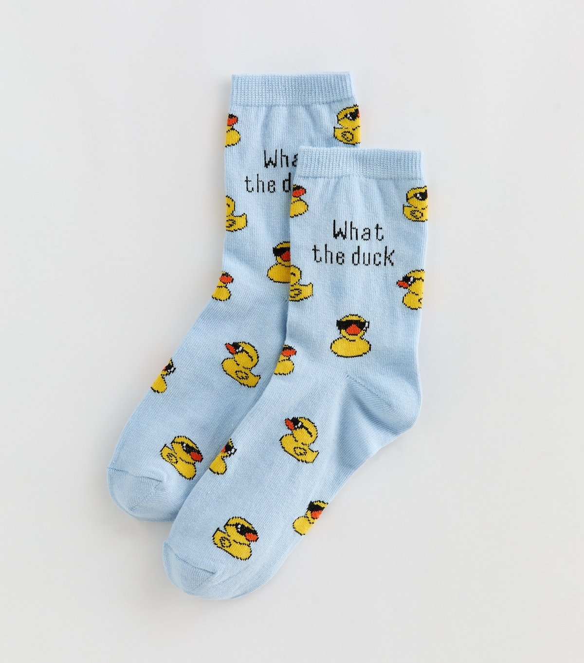 Quirky mid blue ankle socks with a playful duck pattern and slogan design. Made from soft knit fabric, these socks add a fun twist to any outfit.