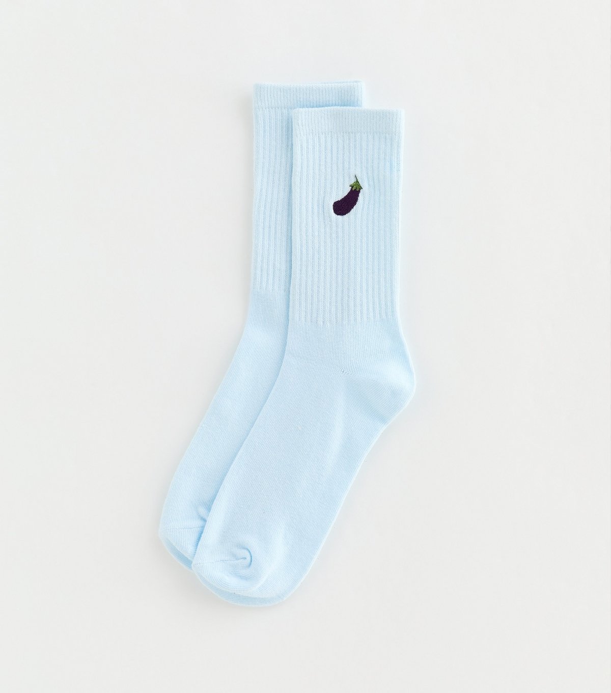 Trendy blue ribbed tube socks with playful aubergine embroidery. Perfect for a casual yet stylish look. Made from ribbed fabric for a snug fit.