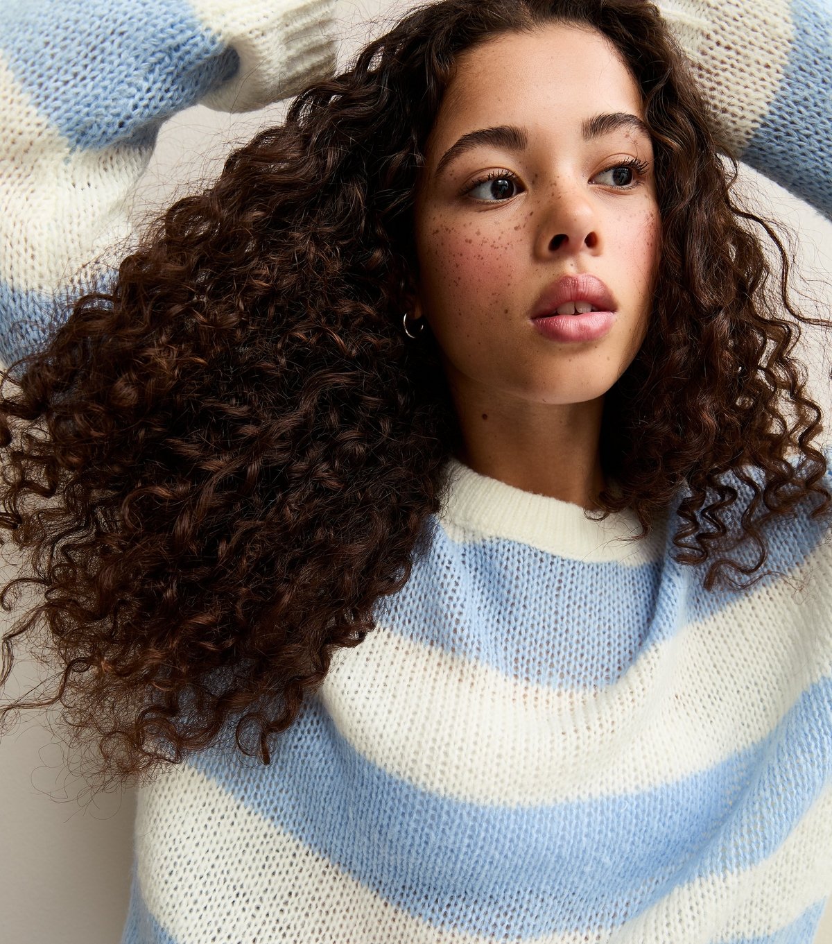 This light blue and white striped open knit jumper from New Look adds a fresh touch to any wardrobe. Featuring a relaxed slouchy fit and dropped sleeves, it's perfect for casual wear.