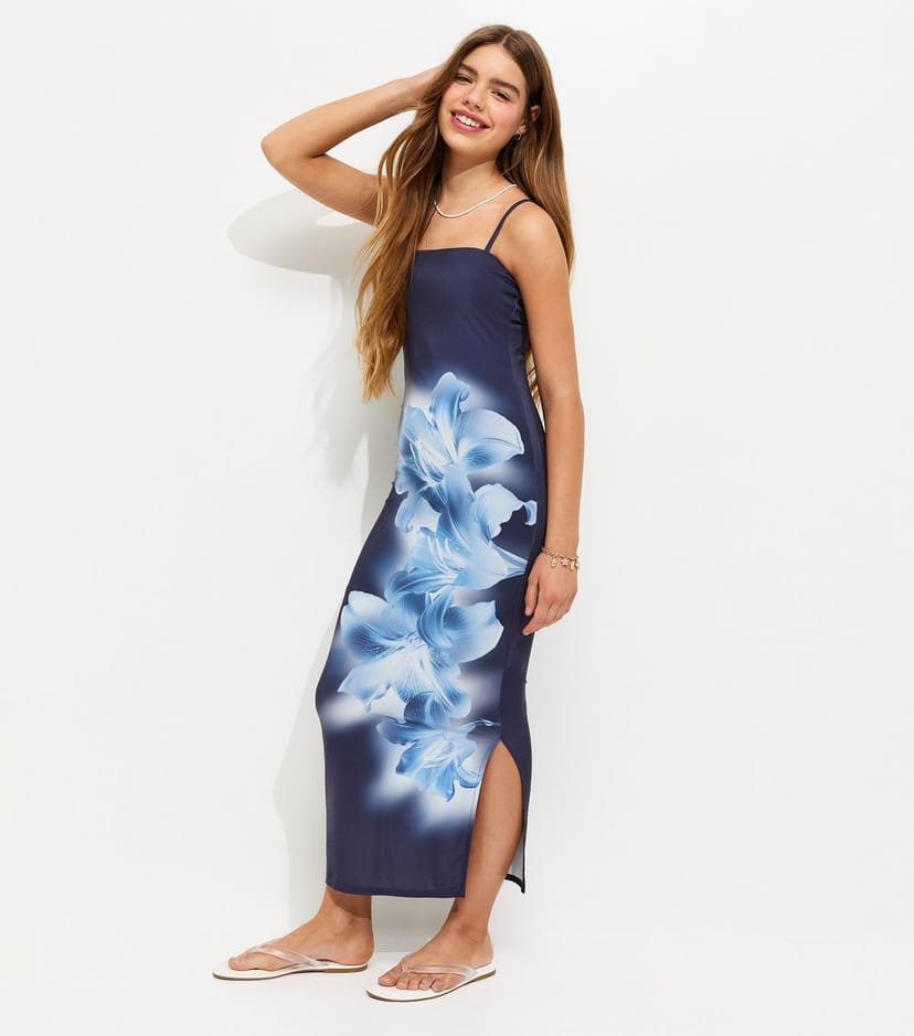 The New Look Navy Floral Print Maxi Dress is available in sizes 10-11 YEARS, 12-13 YEARS, 14-15 YEARS, 9 YEARS.