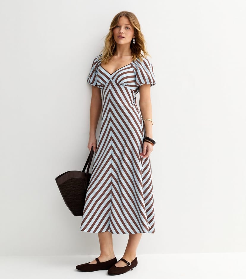 The New Look Blue Contrast Stripe Puff Sleeve Midi Dress is ideal for casual, day-to-night.