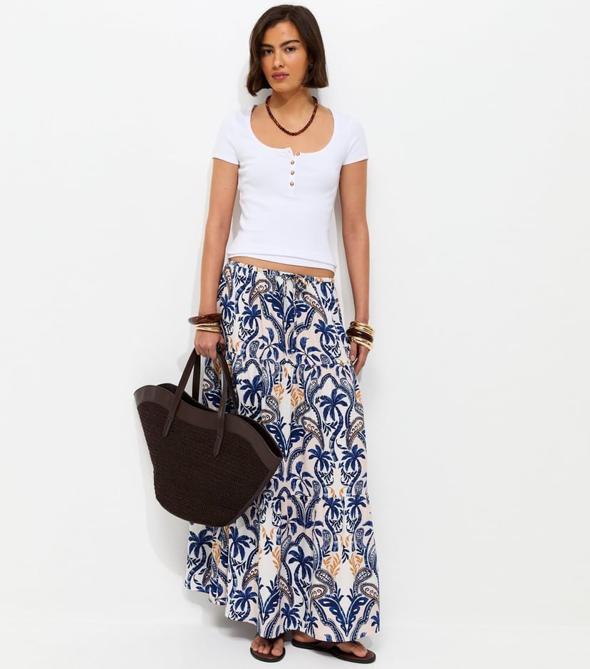 See all outfit ideasThis blue palm print midi skirt from New Look features an intricate palm pattern and a tiered shape for a flowing, a-line silhouette. Ideal for sea-soaked days and holiday wardrobes.