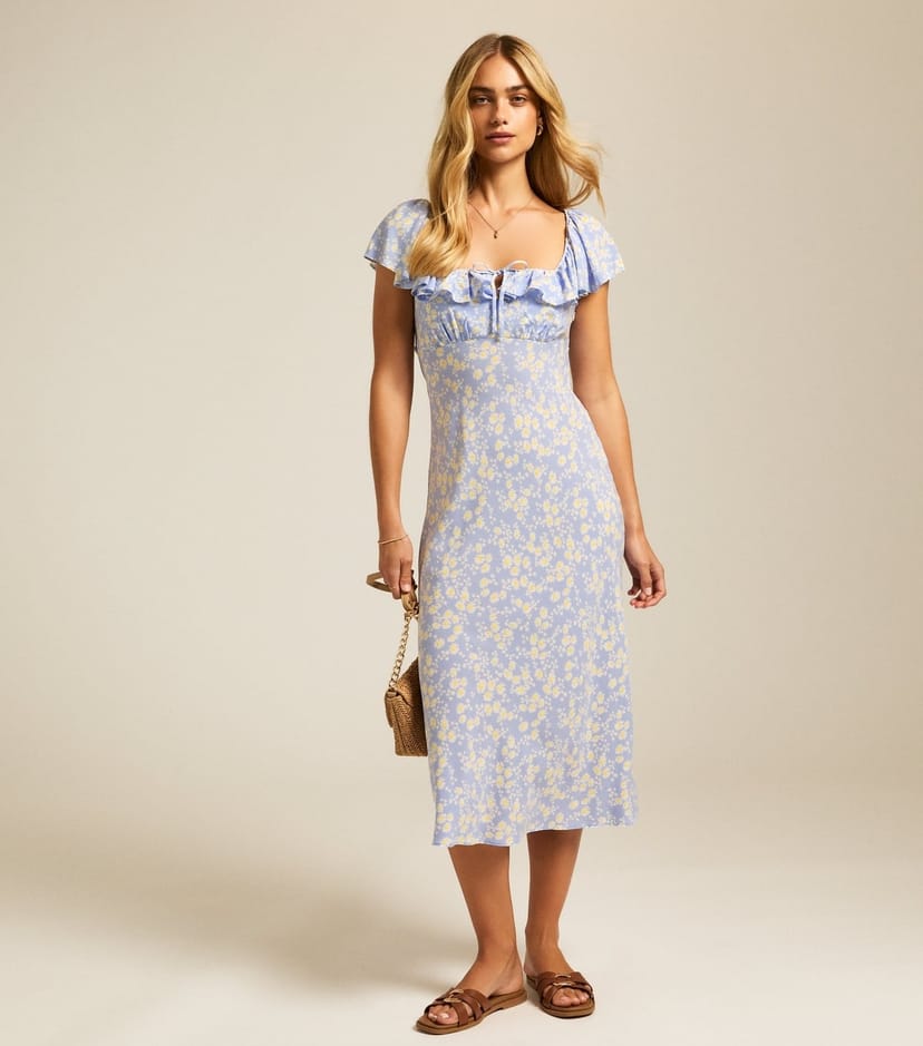 Charming blue daisy print midi dress with a square neckline and ruffled frills. Perfect for casual summer wear.