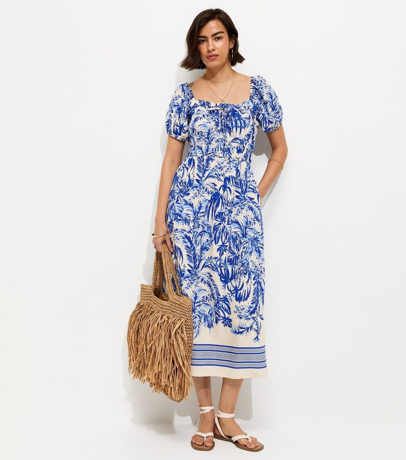 This blue leaf print midi dress from New Look features a square neckline with tie detail and a frilly trim. Made from woven fabric, it offers a slim fit and is perfect for summer days.