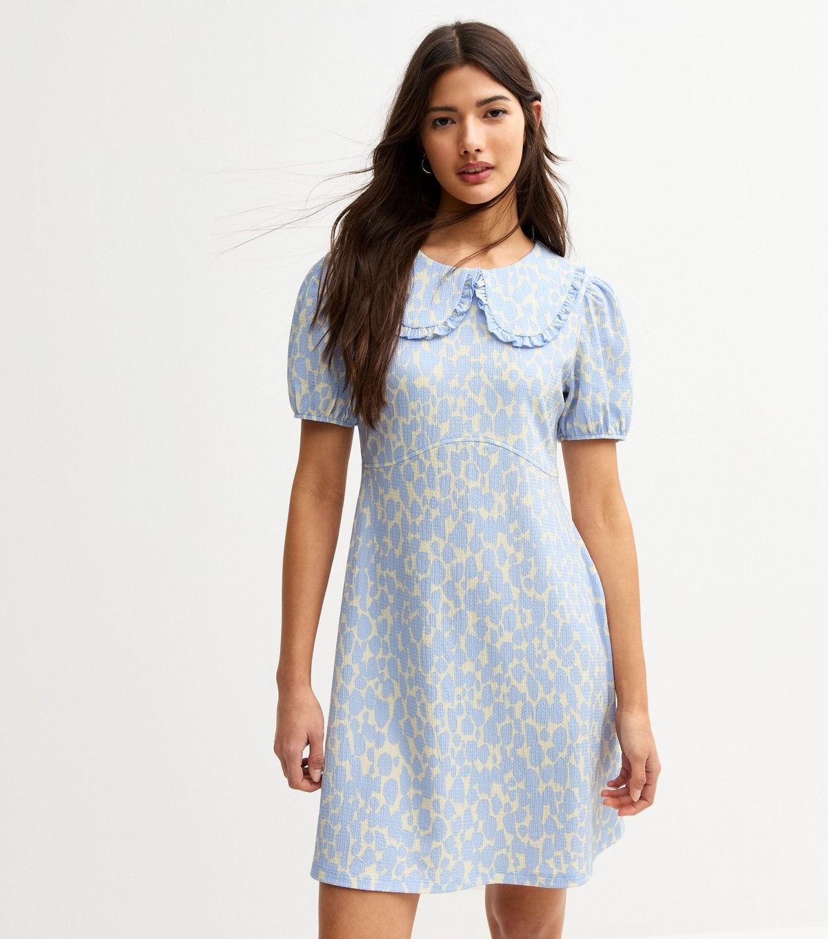 Charming blue leopard print mini dress with a crinkle texture and a sweet frill collar. Its flared shape offers a flattering and feminine silhouette, perfect for summer dressing.