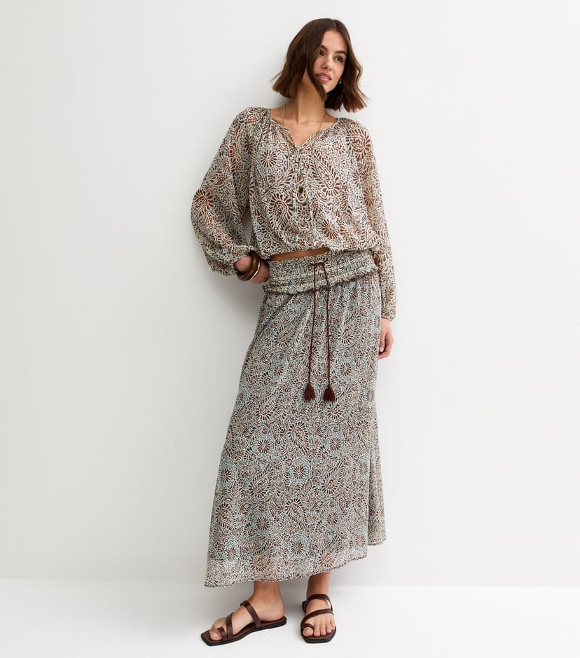 This blue paisley chiffon midi skirt from New Look features a bohemian vibe with its paisley pattern and tassel ties. The sheer fabric adds a touch of elegance, making it perfect for casual outings or outdoor events.