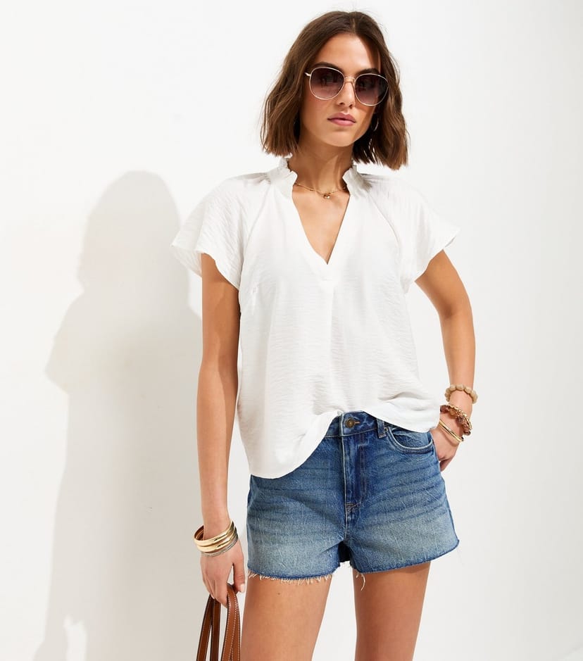 The New Look White V-Neck Blouse with Blue Denim Shorts is ideal for casual, everyday, beach.