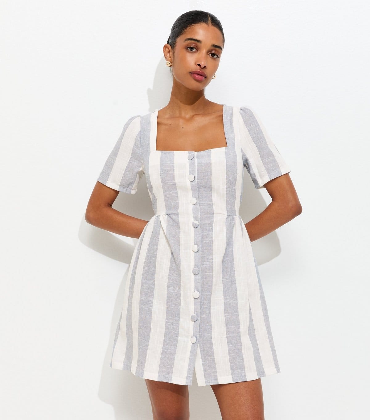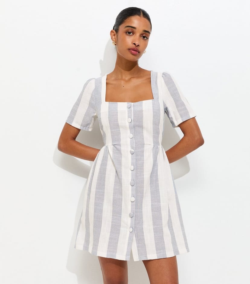 The New Look Blue Stripe Square Neck Button Up Mini Dress is made from woven, lightweight.