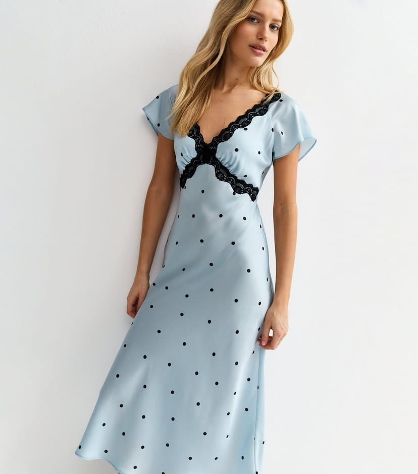 The New Look Blue Satin Polka Dot Lace Trim Midi Dress is ideal for evening, date-night, party.