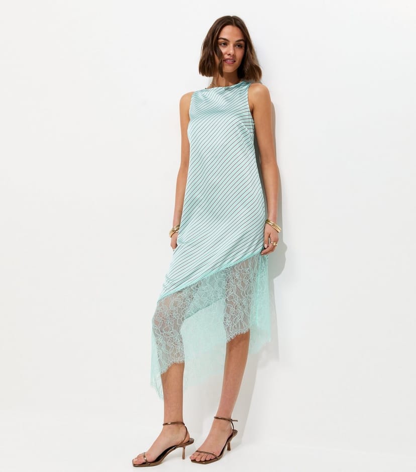 See all outfit ideasThis blue satin midi dress features a striped pattern and an asymmetric lace hem. The sheer lace trim adds a touch of elegance, perfect for evening events.
