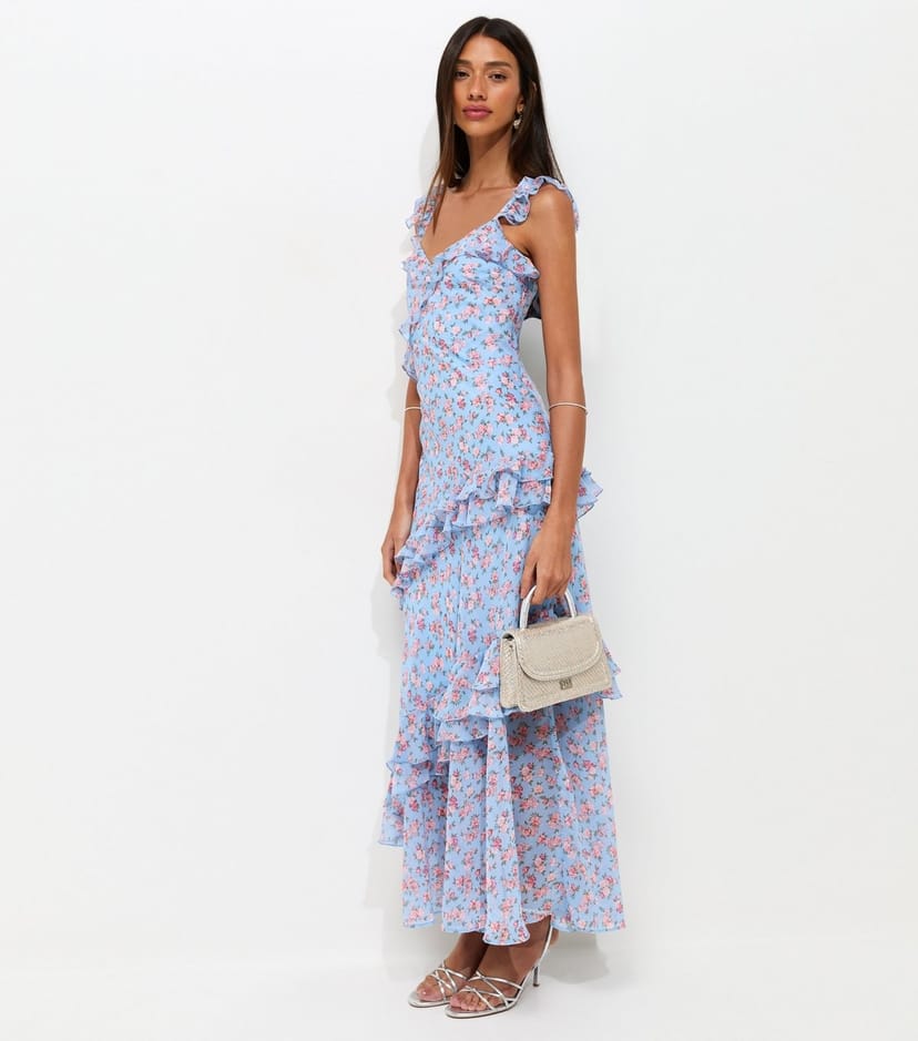 This blue floral print midi dress from New Look features a V-neckline and ruffled straps. The flowing silhouette and floral pattern make it perfect for weddings and garden parties.