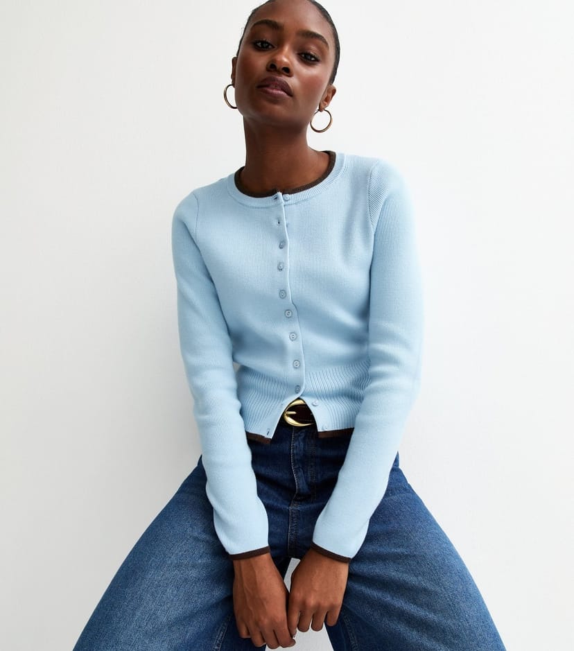 This light blue cardigan from New Look features a ribbed texture and is outlined with contrast chocolate-brown tipping. Its classic fit and simple design make it a versatile staple for daily wear.