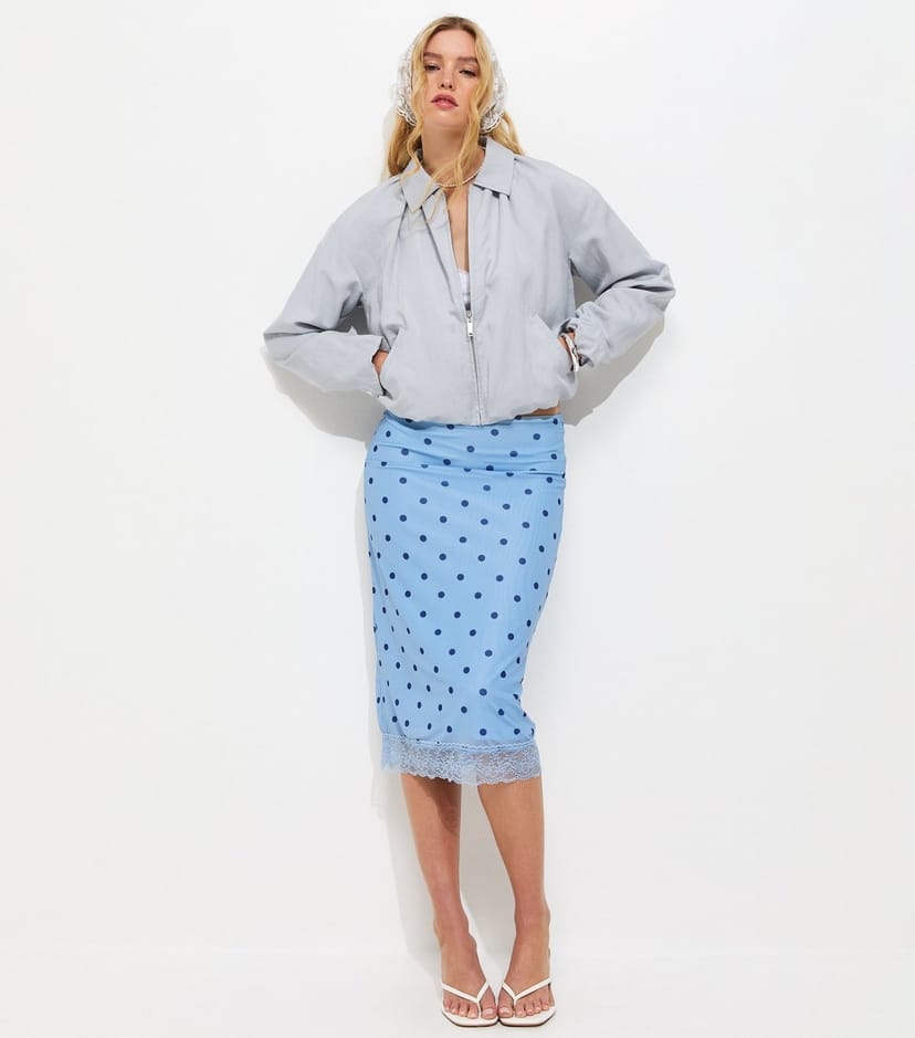 See all outfit ideasChic light blue polka dot midi skirt with a lace trim and mesh fabric. Features a slim fit and mid-rise waist. Perfect for casual outings or adding a playful touch to your wardrobe.