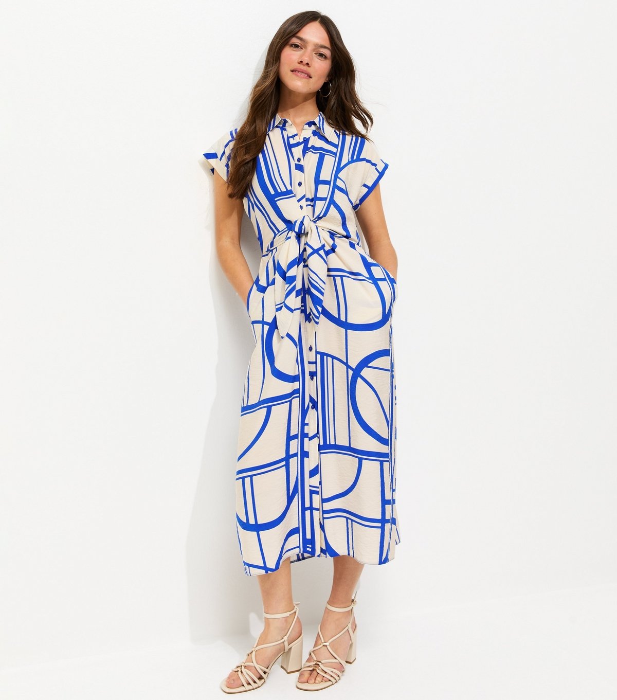 The New Look Blue Geometric Print Midi Shirt Dress is available in sizes 10, 12, 14, 16, 4, 6, 8.