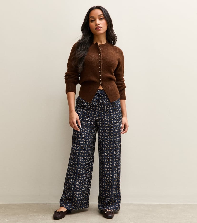 The New Look Blue Satin Paisley Wide Leg Trousers is available in sizes 10, 12, 14, 16, 6, 8.