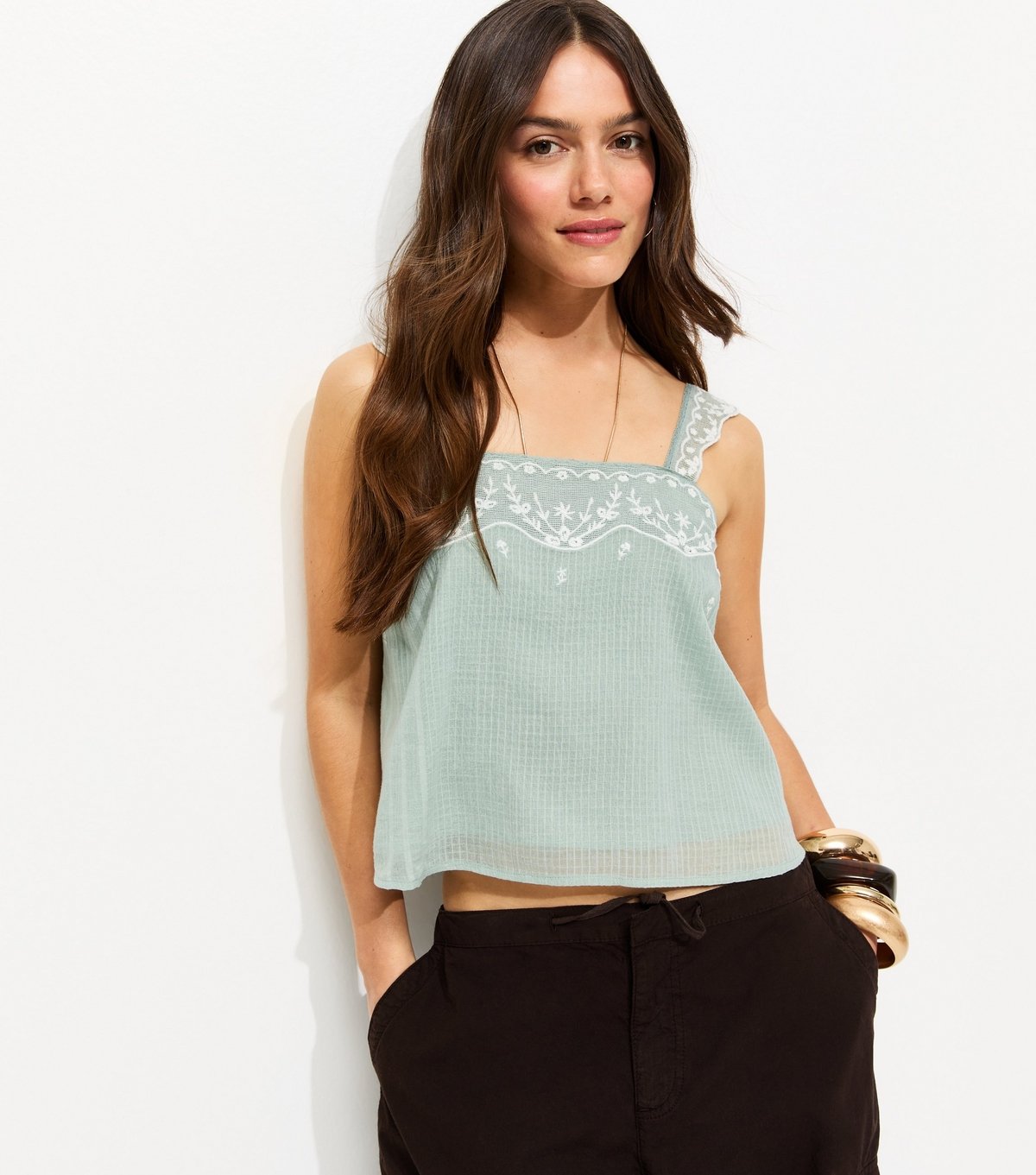 The New Look Mint Green Embroidered Peplum Cami Top is ideal for casual, daytime, summer.