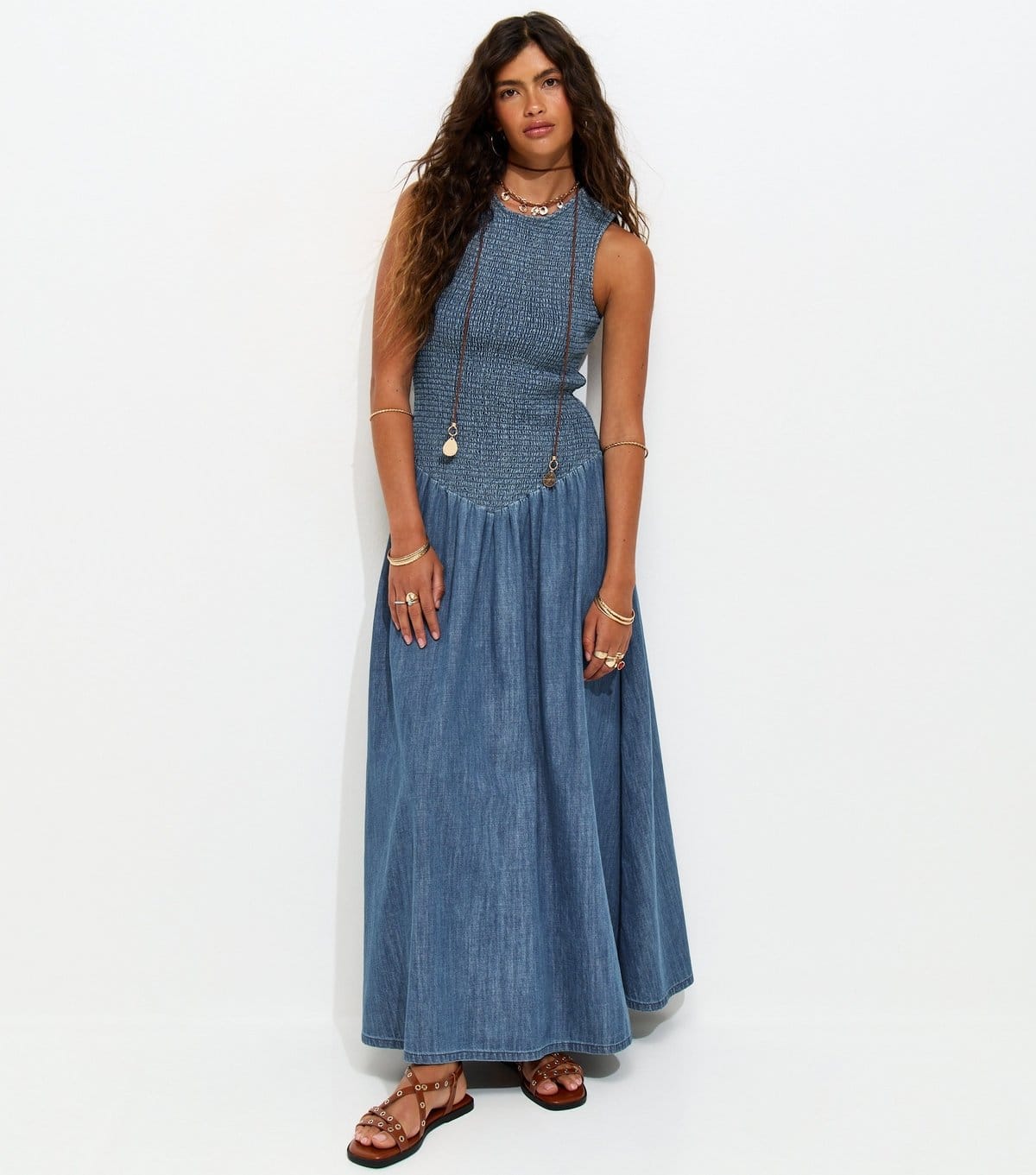 The New Look Blue Denim Shirred Maxi Dress is available in sizes 10, 12, 14, 16, 18, 6, 8.