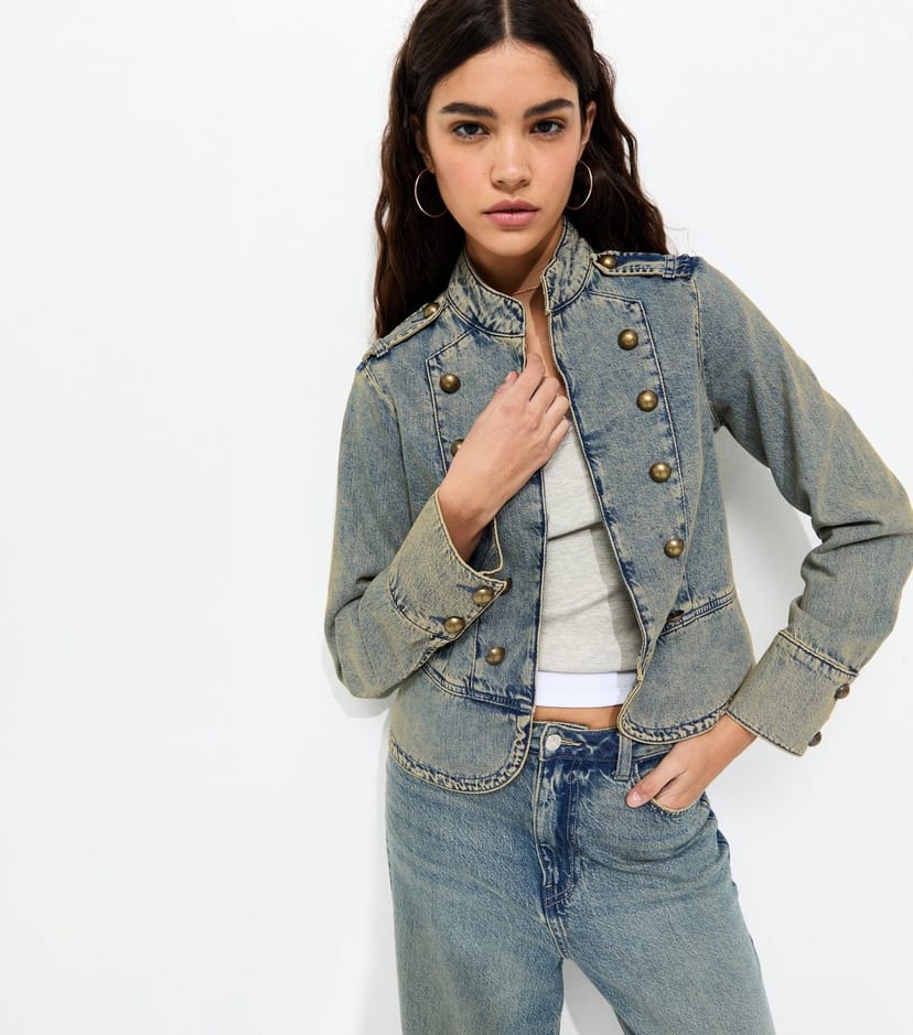 View New Look UK's returns policyThis blue denim jacket from New Look features a drummer style with shoulder tabs and dome buttons. It has a faded wash for a lived-in look. Ideal for casual wear.