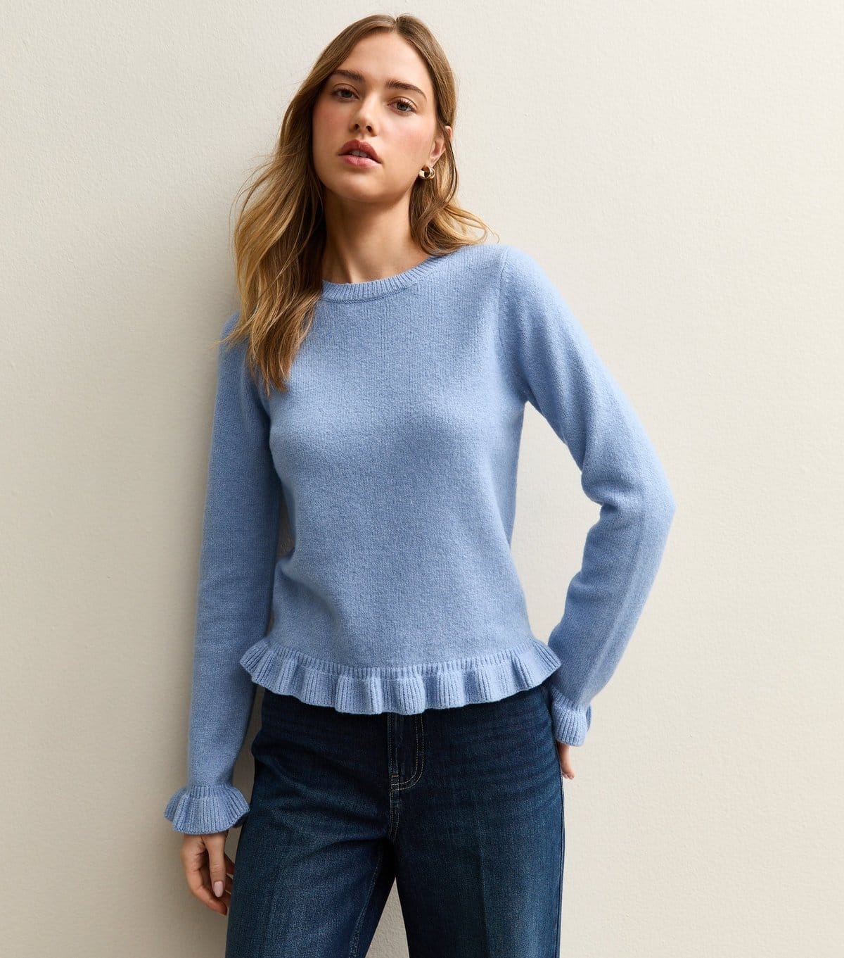 This blue jumper from New Look features a gentle look with its soft blue shade and frilly trim. Made from midweight knit, it has a cosy brushed finish. Ideal for casual wear.