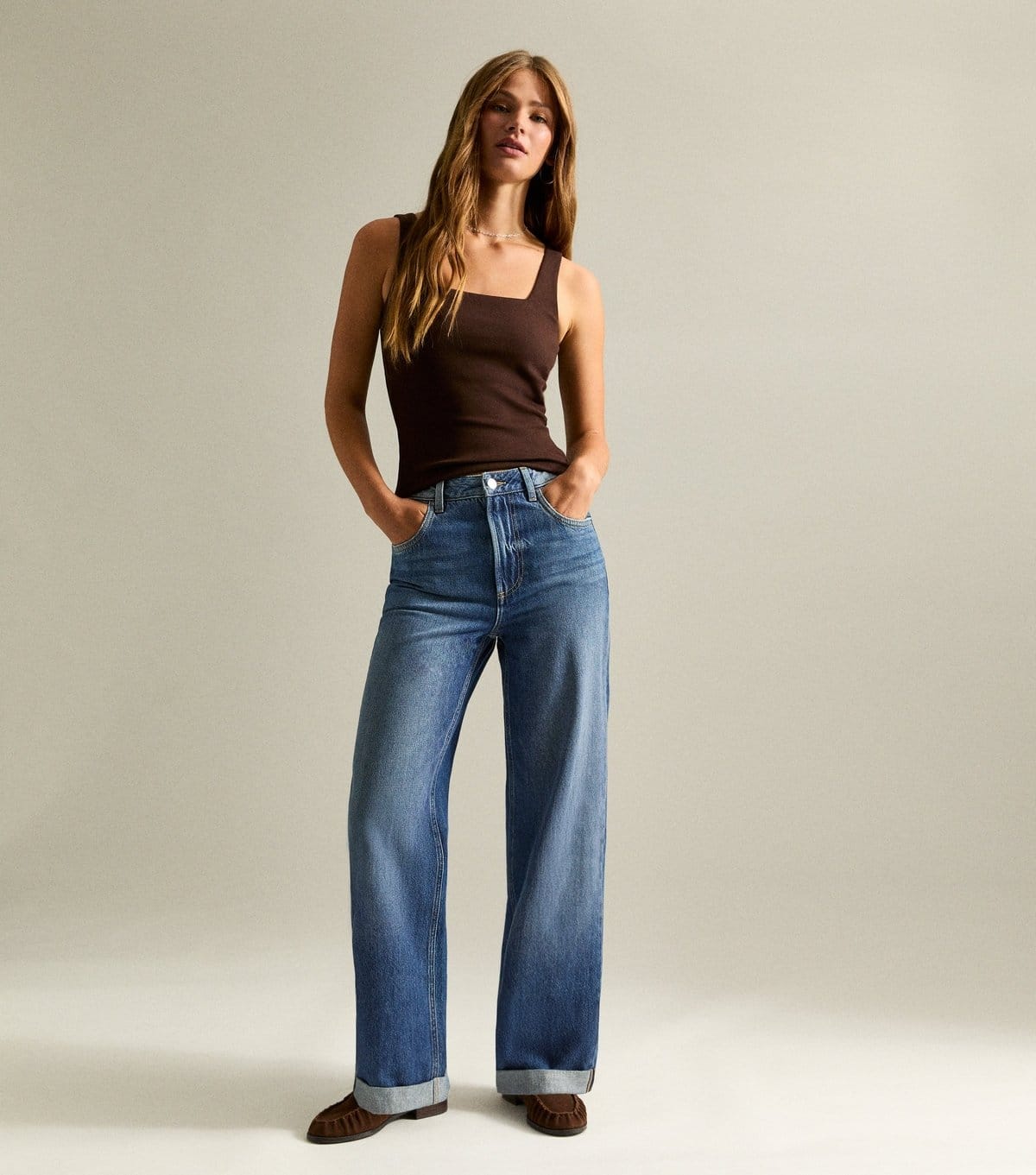 Stylish blue denim wide-leg jeans with a relaxed fit and turned-up cuffs. Ideal for a casual and effortless look.