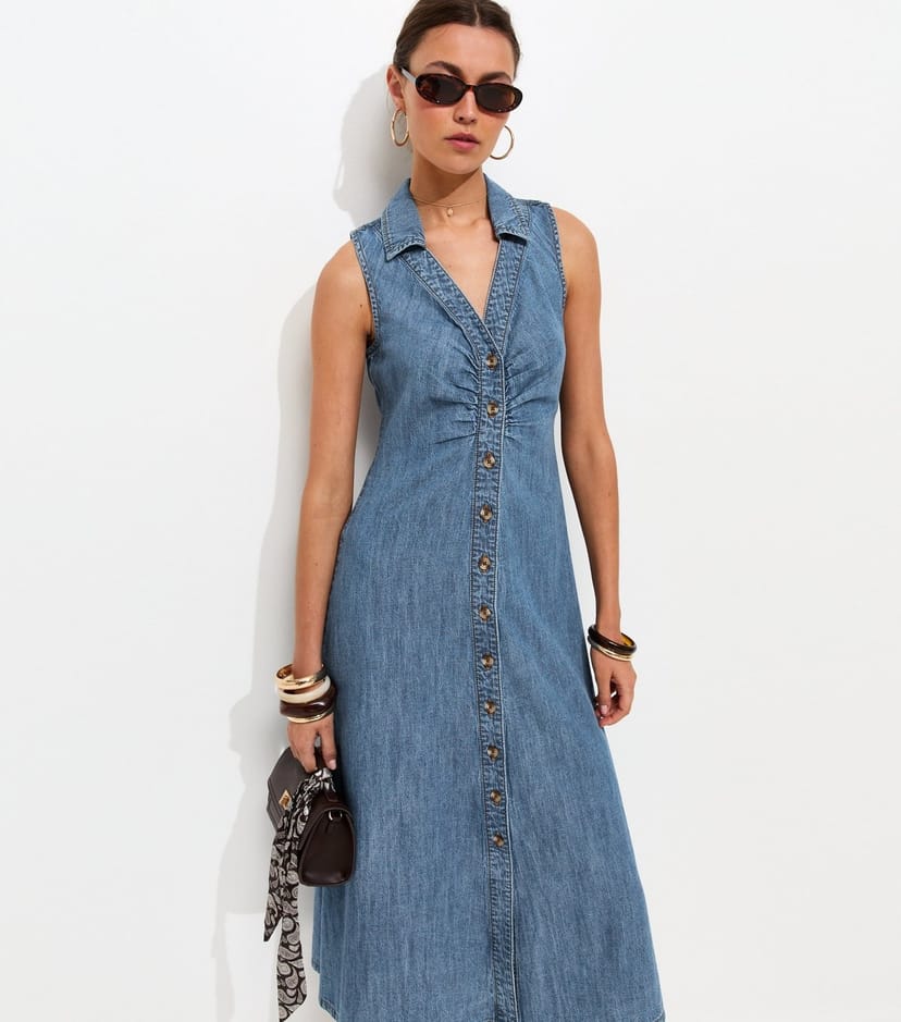 The New Look Mid Blue Wash Denim A-line Midi Dress is made from denim.