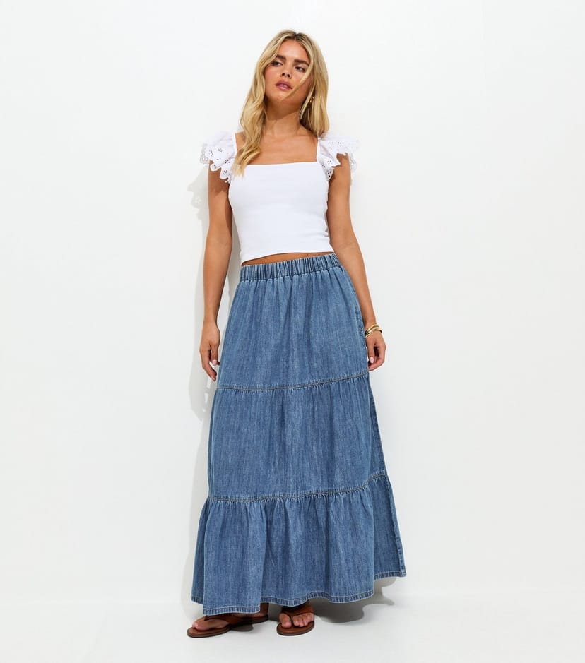 This blue denim midi skirt from New Look is perfect for summertime styling. Featuring tiered layers and an elasticated waistband, it adds a folk feel to your daytime looks. The practical pockets ensure comfort throughout the day.