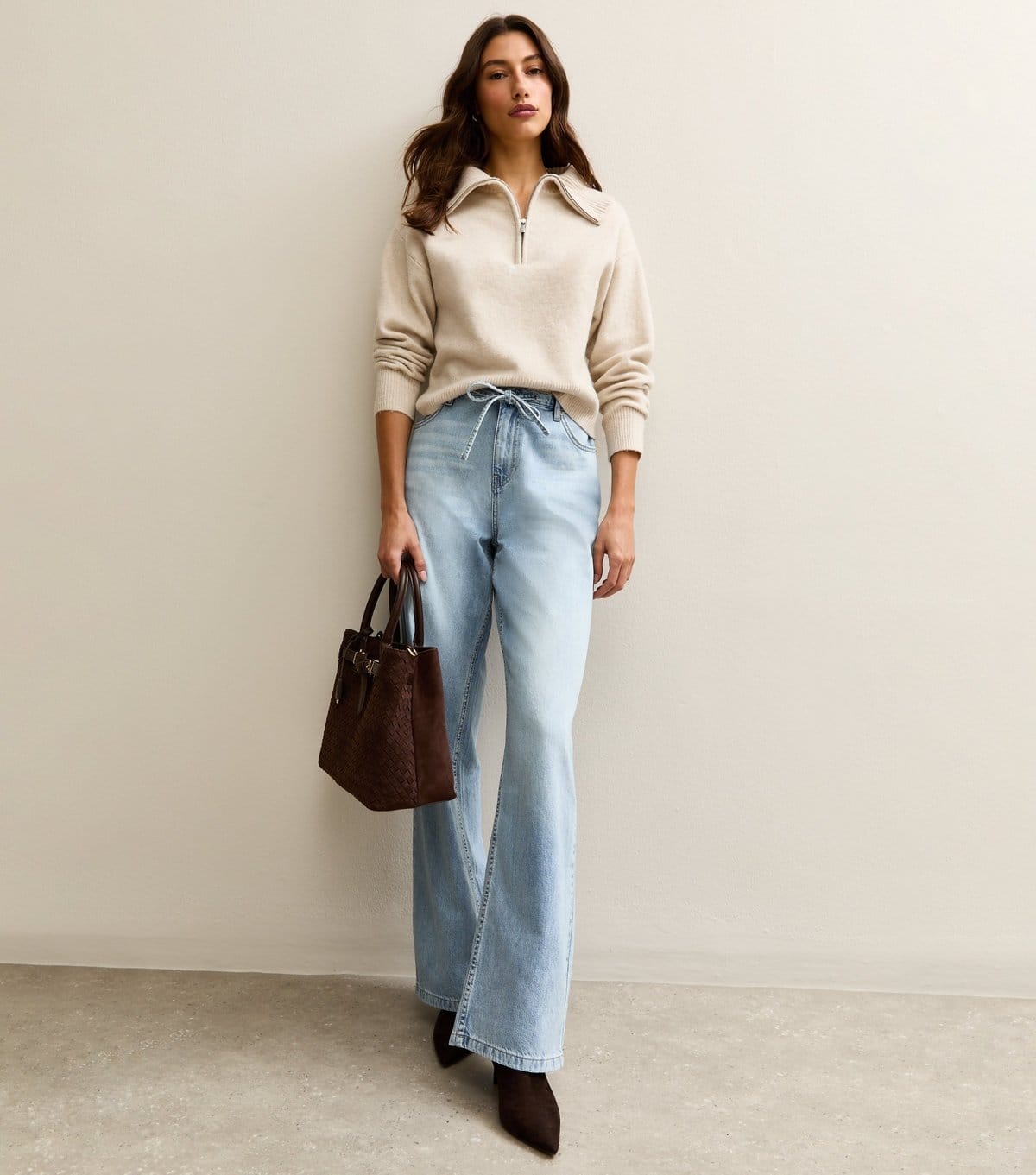 Stylish blue denim wide leg jeans by New Look. Featuring a relaxed fit and a drawstring waist, these jeans are perfect for casual wear. The tie front detail adds a unique touch.