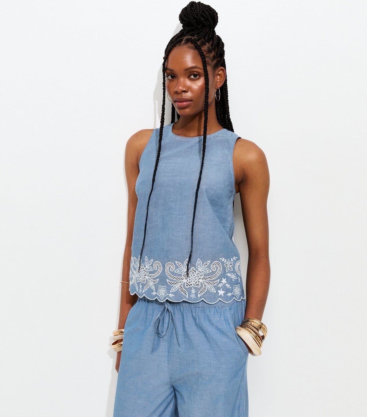 The New Look Blue Embroidered Scalloped Hem Top is ideal for casual, summer, daytime.
