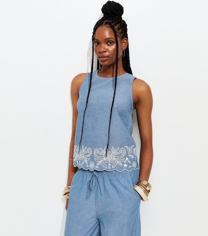 The New Look Blue Embroidered Scalloped Hem Top is made from cotton, polyester.