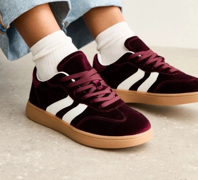 The trainers feature a burgundy velvet finish with contrasting white stripes on the side. Perfect for a casual yet stylish look.