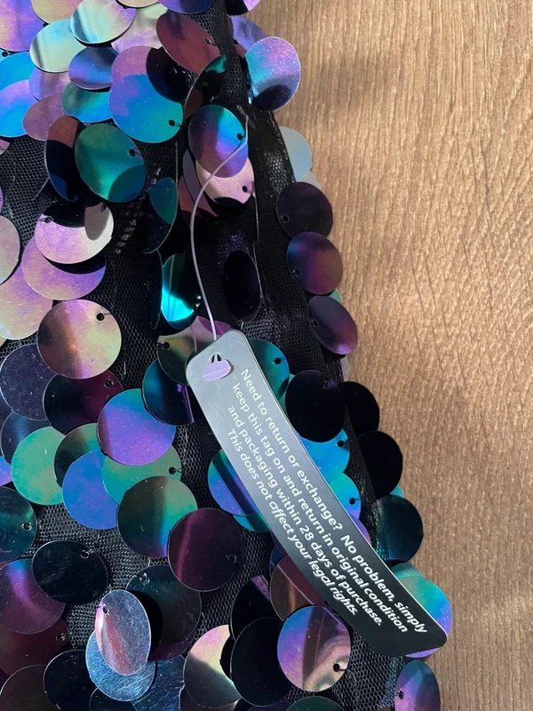 Holographic Sequin Mini Dress — the must-have party dress for going out. Designed in vibrant holographic sequins, this mini dress features a hidden zip and under slip for comfort and coverage. Crafted from lightweight sheer mesh with subtle shimmer, it catches the light beautifully. Includes spare sequins for easy reattachment.