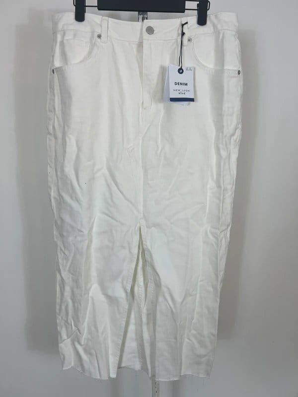 This brand-new white denim maxi skirt from New Look features a split at the bottom down the front and is a frayed hem by design. Ideal for casual wear.
