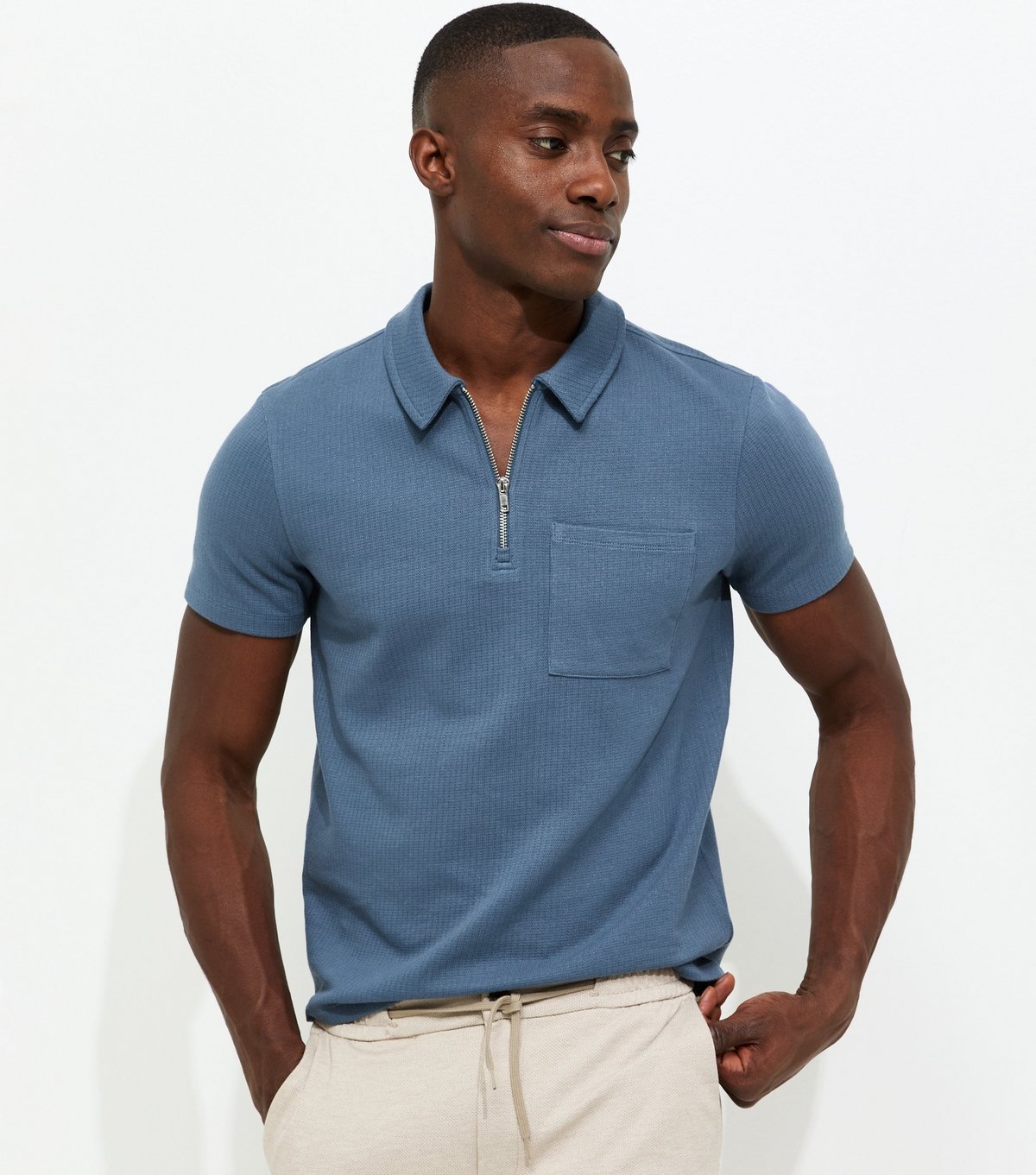Stylish dark blue textured polo shirt with a zip collar for a smart-casual look. Ideal for relaxed weekends or smart-casual days. Made from jersey fabric with a striped texture.