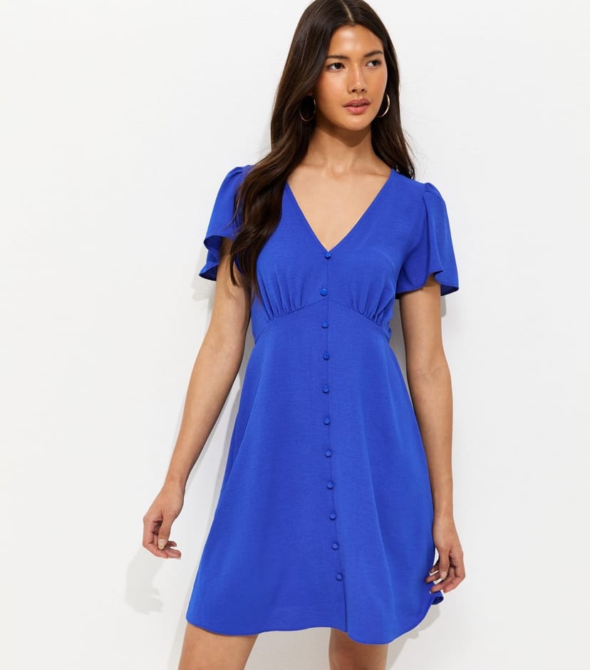 The New Look Bright Blue Flutter Sleeve Mini Tea Dress is available in sizes 10, 12, 14, 16, 18, 20, 22, 6, 8.