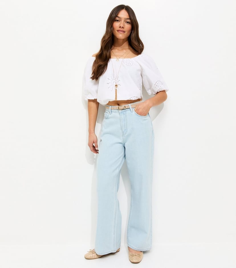 Stylish light blue wash jeans with a high waist and wide leg design. Made from classic denim, these jeans are perfect for everyday casual wear.