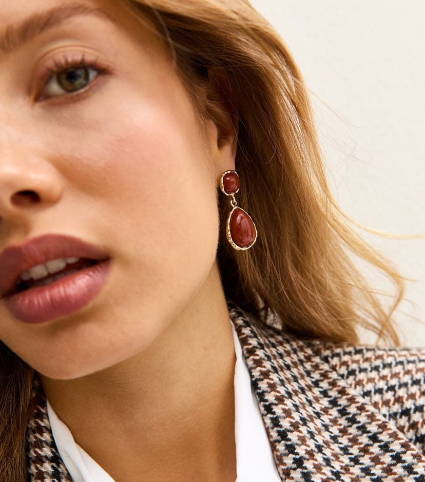 These orange oval drop earrings from New Look feature smooth stone drops outlined with a textured finish. Perfect for adding a pop of rich colour to any outfit. Made from stone and finished with a gold tone, these earrings are a stylish addition to your jewellery collection.