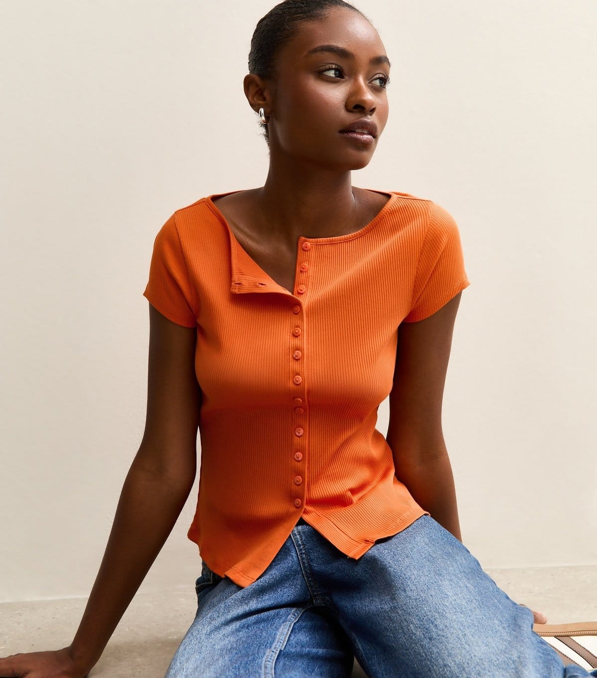 Bright and bold, this orange ribbed jersey baby tee from New Look adds a pop of colour to any outfit. Featuring a button-through front and a crew neckline, it's perfect for relaxed, everyday wear.