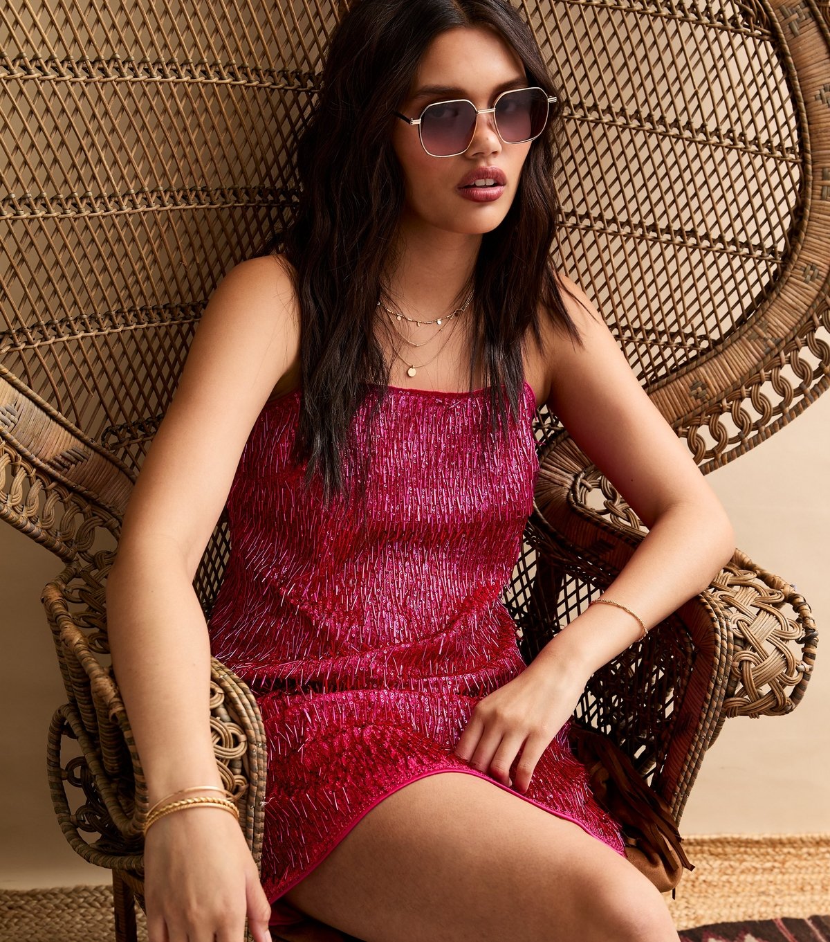 This bright pink mini dress by New Look features a classic shift silhouette adorned with bead and sequin tassels. Ideal for festivals and evening events, it promises to make you shine bright.