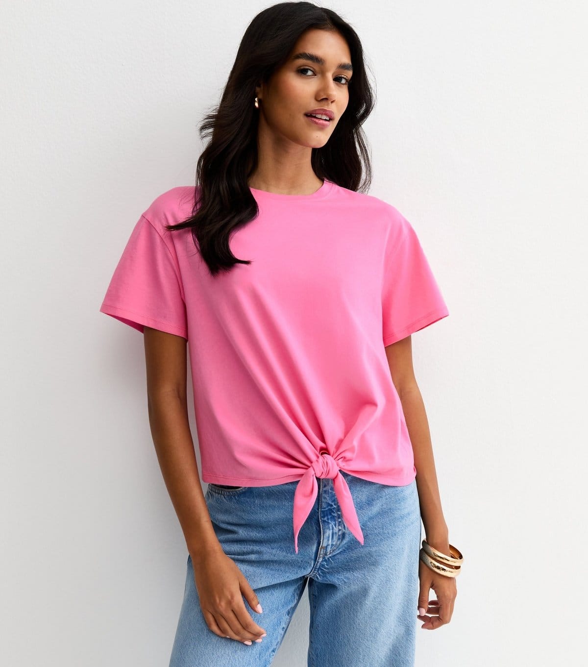 The New Look Bright Pink Tie Front T-Shirt is made from cotton jersey.