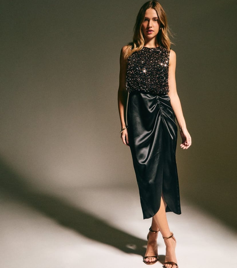 Luxurious black and bronze sequin 2 in 1 midi dress from New Look. The bronze sequin top contrasts with the heavily ruched satin skirt, creating a texture-rich and special look for any occasion.