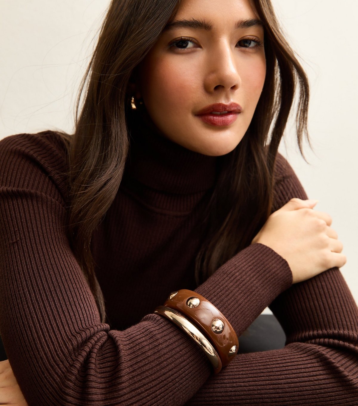 Elevate your wristwear with this pack of two gold tone chunky resin bangles from New Look. The slim gold bangle pairs perfectly with the brown resin design adorned with studs. Ideal for adding a touch of elegance to any outfit.