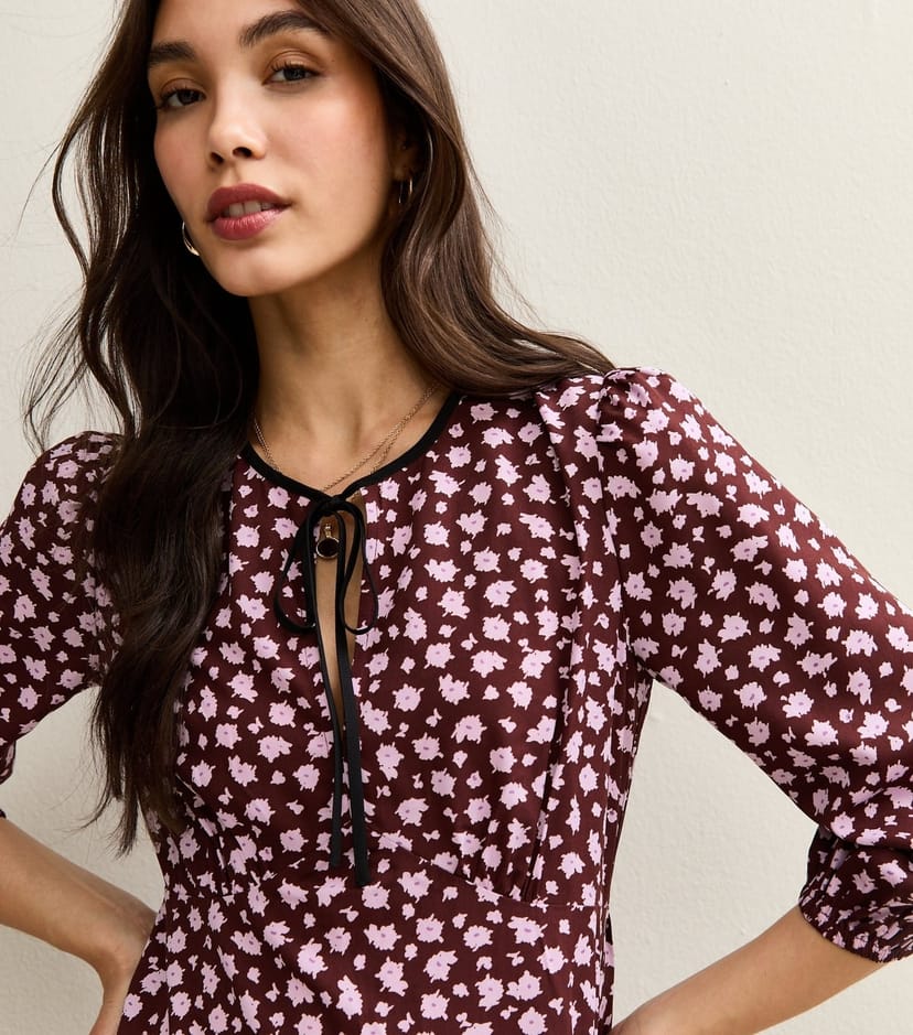The New Look Brown Floral Print Tie Neck Midi Dress is available in sizes 10, 12, 14, 16, 18, 20, 22, 6, 8.