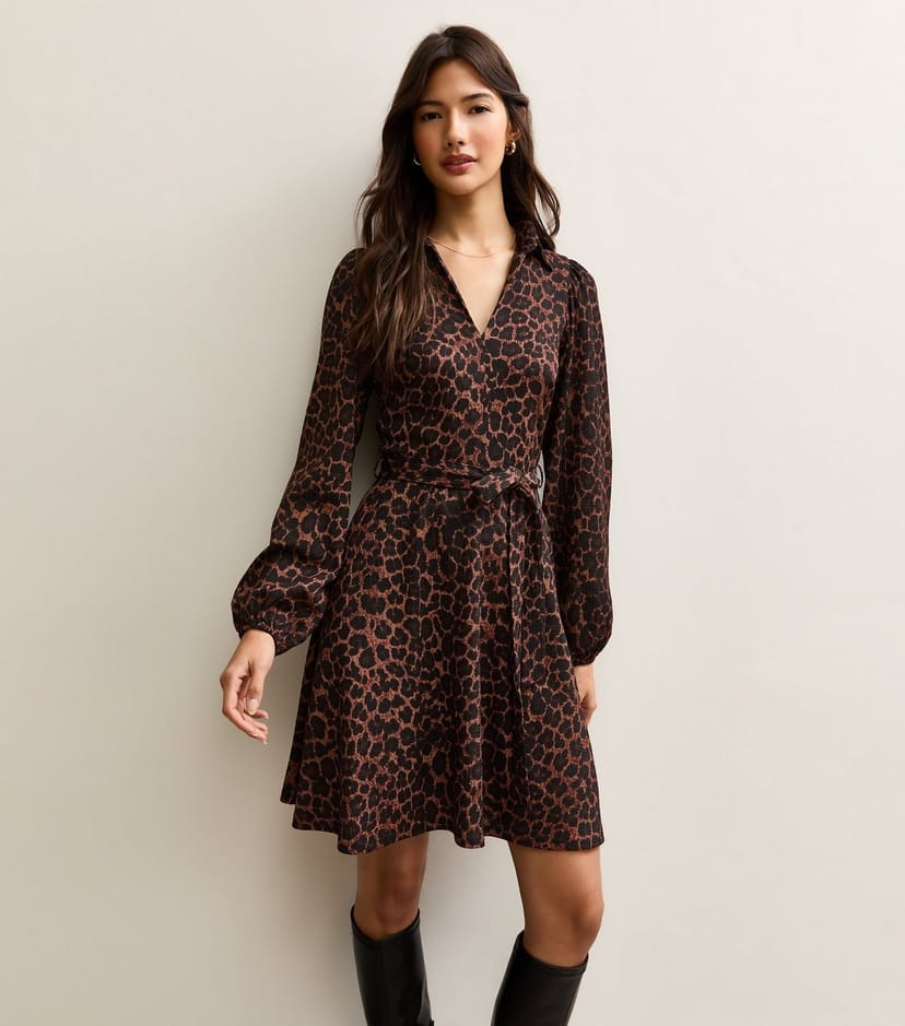 The New Look Brown Animal Print Long Sleeve Mini Dress is available in sizes 10, 12, 14, 16, 18, 20, 22, 6, 8.