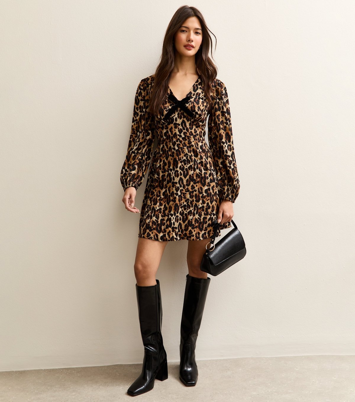 The New Look Brown Animal Print Velvet Bow Mini Dress is available in sizes 8.