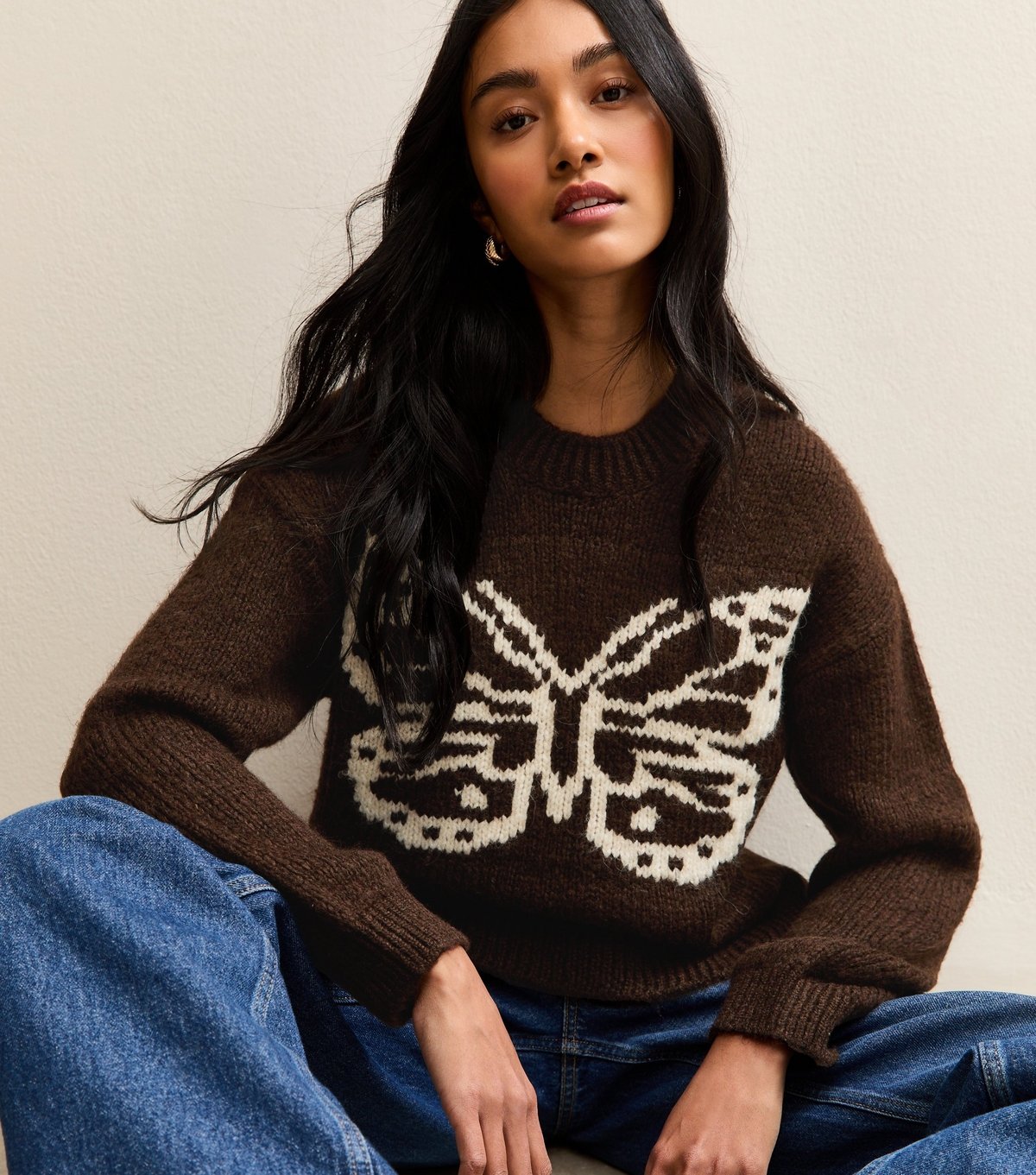 The New Look Brown Butterfly Design Crew Neck Jumper is available in sizes S.