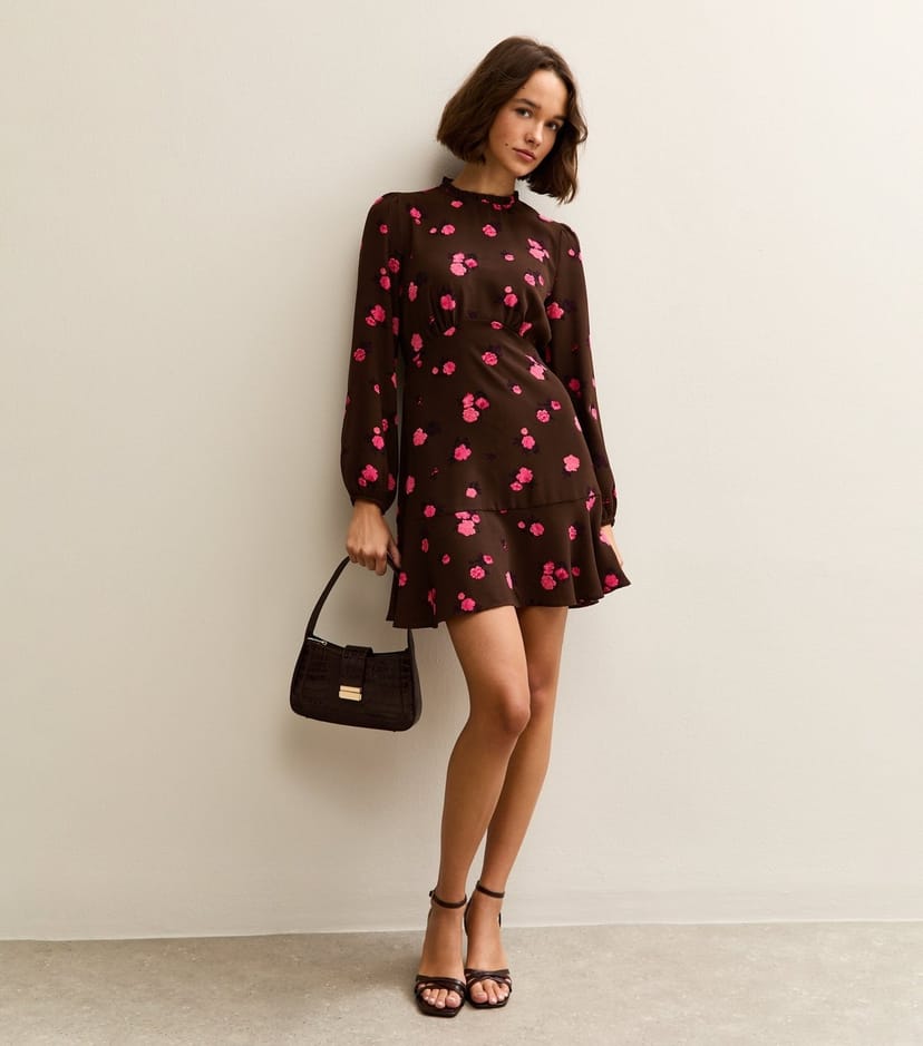 The New Look Brown Floral Long Sleeve Mini Dress is ideal for casual, date-night.