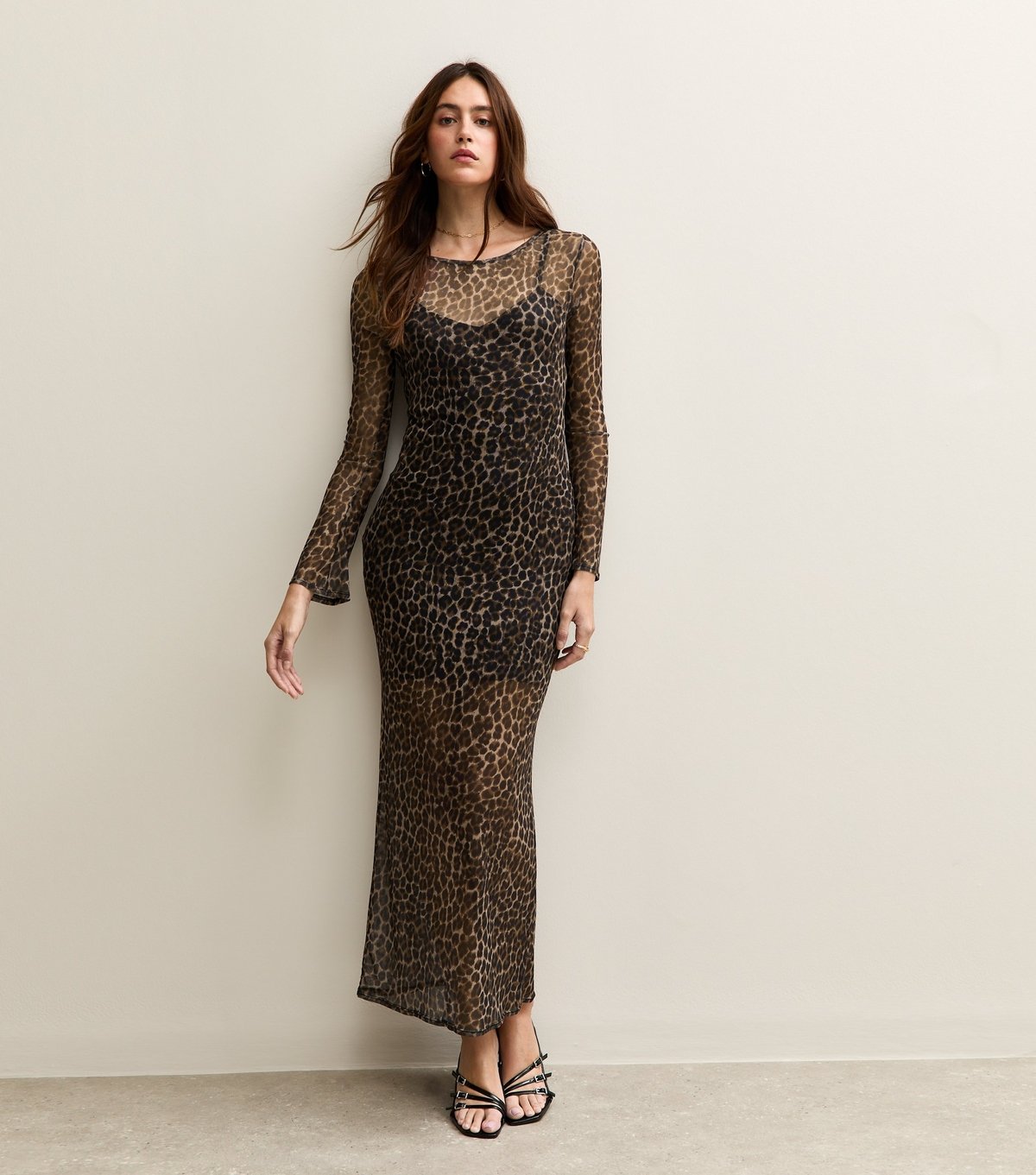 The New Look Brown Leopard Print Cowl Back Midi Dress is made from mesh.