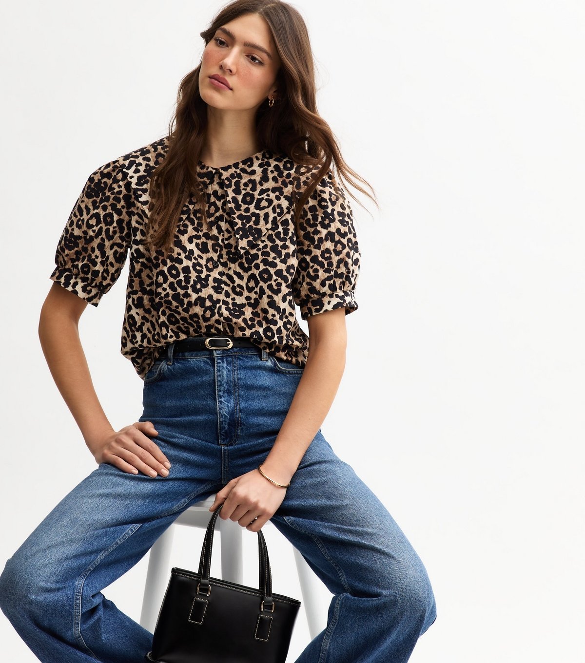 The New Look Brown Leopard Print Oversized Collar Shirt is available in sizes 6.