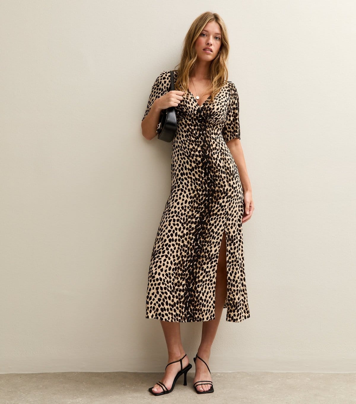 View New Look UK's returns policyThis brown leopard-print midi dress will add a bold touch to your dresses rotation. With its flattering A-line silhouette, it features a V-neckline and chic slit hem. Perfect for evening events or date nights.