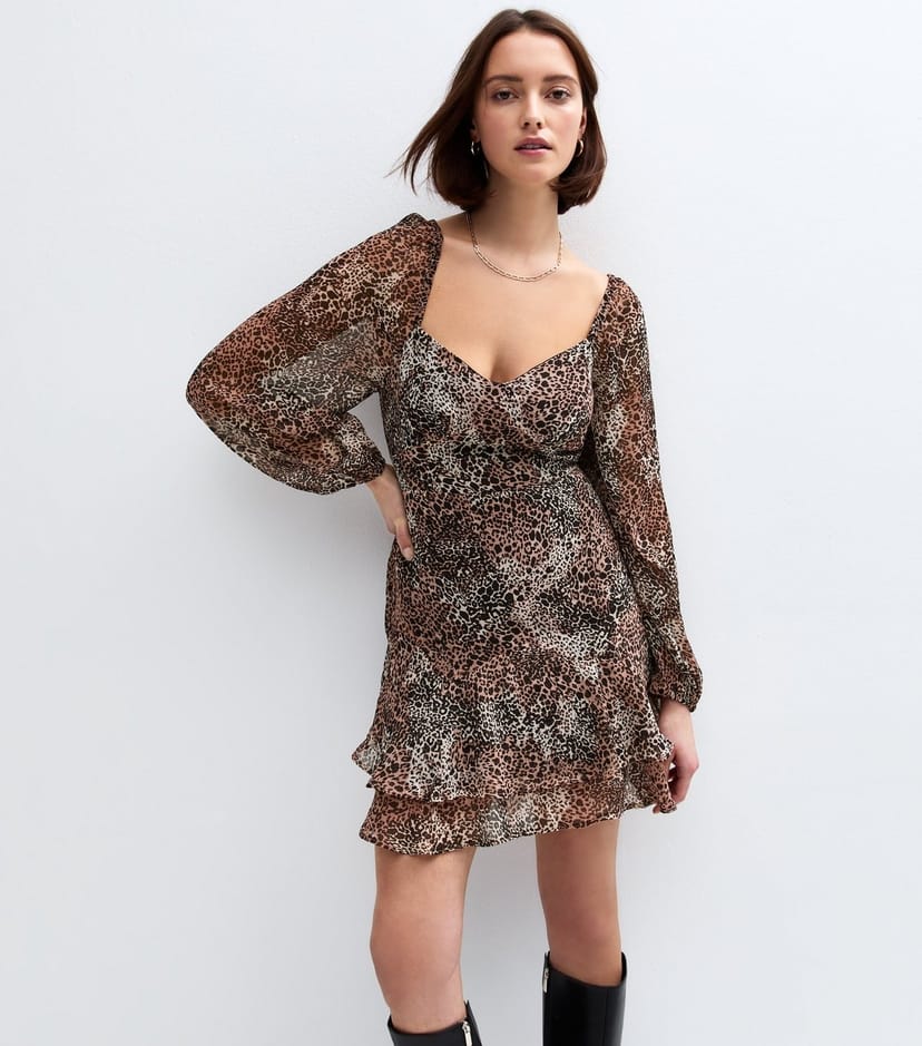 Make a bold statement with this leopard-print mini dress from New Look. Crafted from chiffon, it features a sweetheart neckline, balloon sleeves, and a layered frilly hem. Ideal for evening events or casual outings.